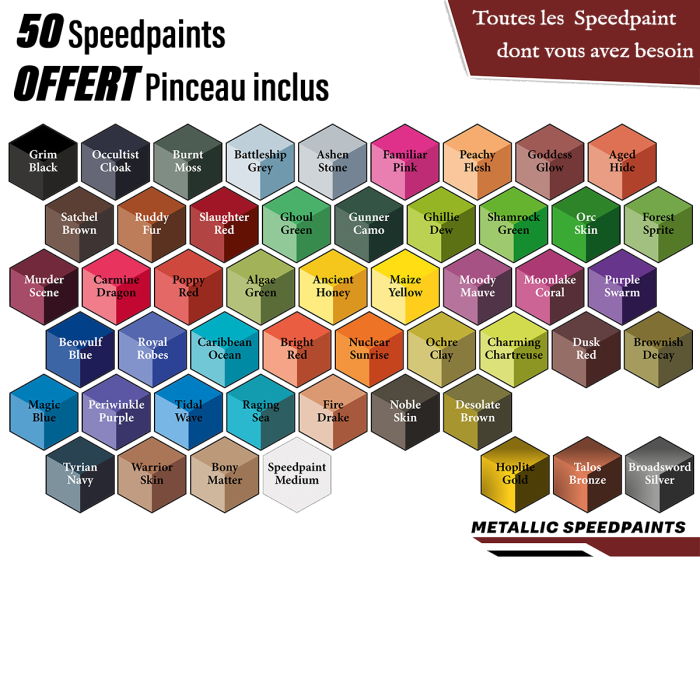 Le Speedpaint tout-en-un est une véritable solution de peinture monocouche. Par rapport à son prédécesseur, le nouveau 2.0 Mega Set 2.0 est livré avec une nouvelle formule, une gamme de couleurs élargie qui comprend 45 nouvelles couleurs, et pour la toute première fois, il présente Speedpaint Metallics ! Au total, le Speedpaint Mega Set 2.0 comprend 46 couleurs, 3 métalliques et 1 Speedpaint Medium - un total de 50 bouteilles - vous permettant de peindre de belles miniatures de qualité de table en un rien de temps ! Appliquez simplement une riche couche de Speedpaint directement sur une figurine apprêtée et le tour est joué. Toutes les couleurs utilisent des pigments lourds de haute qualité éprouvés. Combiné avec une solution innovante de médium en résine qui coule parfaitement sur vos figurines, créant une solution de peinture inégalée pour vous aider à obtenir plus de temps pour le jeu. Boules de mélange préchargées Tous les Speedpaints sont livrés avec deux boules de mélange en acier inoxydable de haute qualité déjà chargées dans la bouteille, ce qui vous permet d'obtenir plus facilement la consistance parfaite. Contenu: 50x Speedpaints 18ml : 45 nouvelles couleurs - dont 3 Speedpaint Metallics 1 médium Speedpaint 4 couleurs Speedpaint de la gamme originale GRATUITEMENT GRATUIT 1x pinceau de base