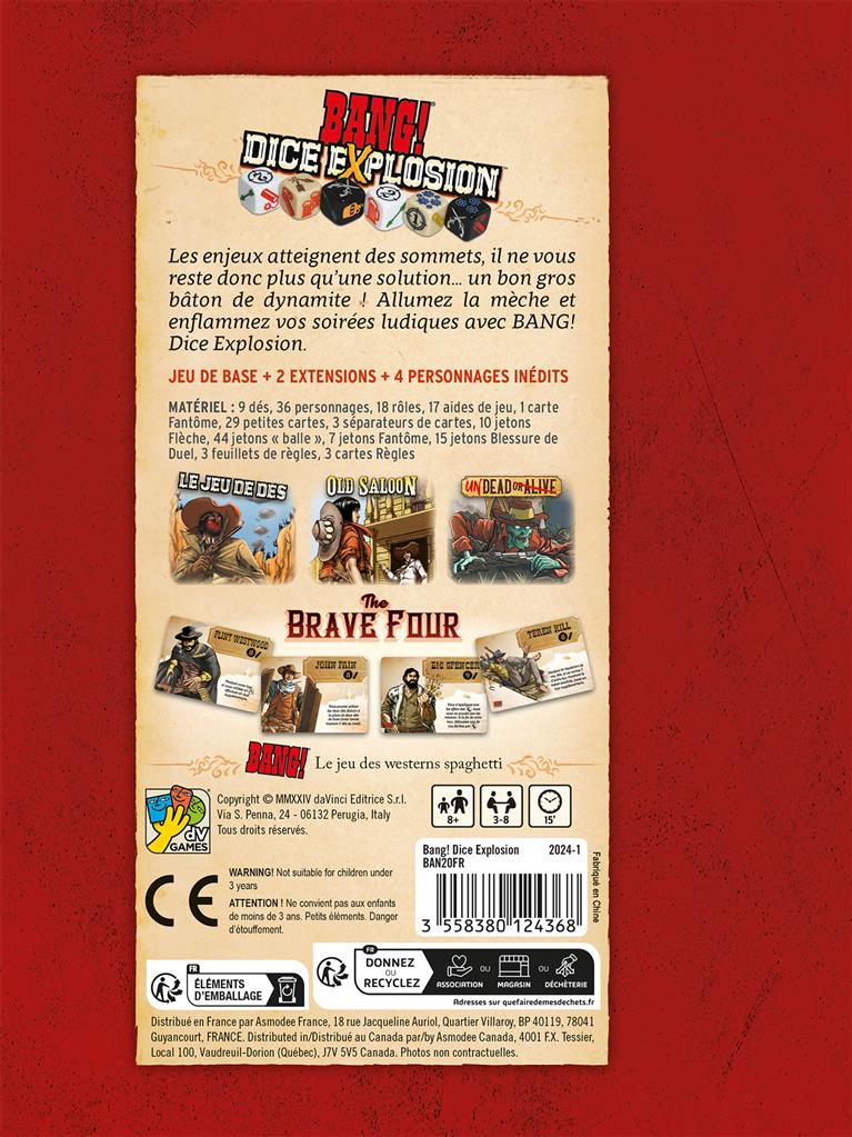 Une boîte tube évoquant un bâton de dynamite qui contient Bang le jeu de dés, ses deux extensions et du matériel supplémentaire !