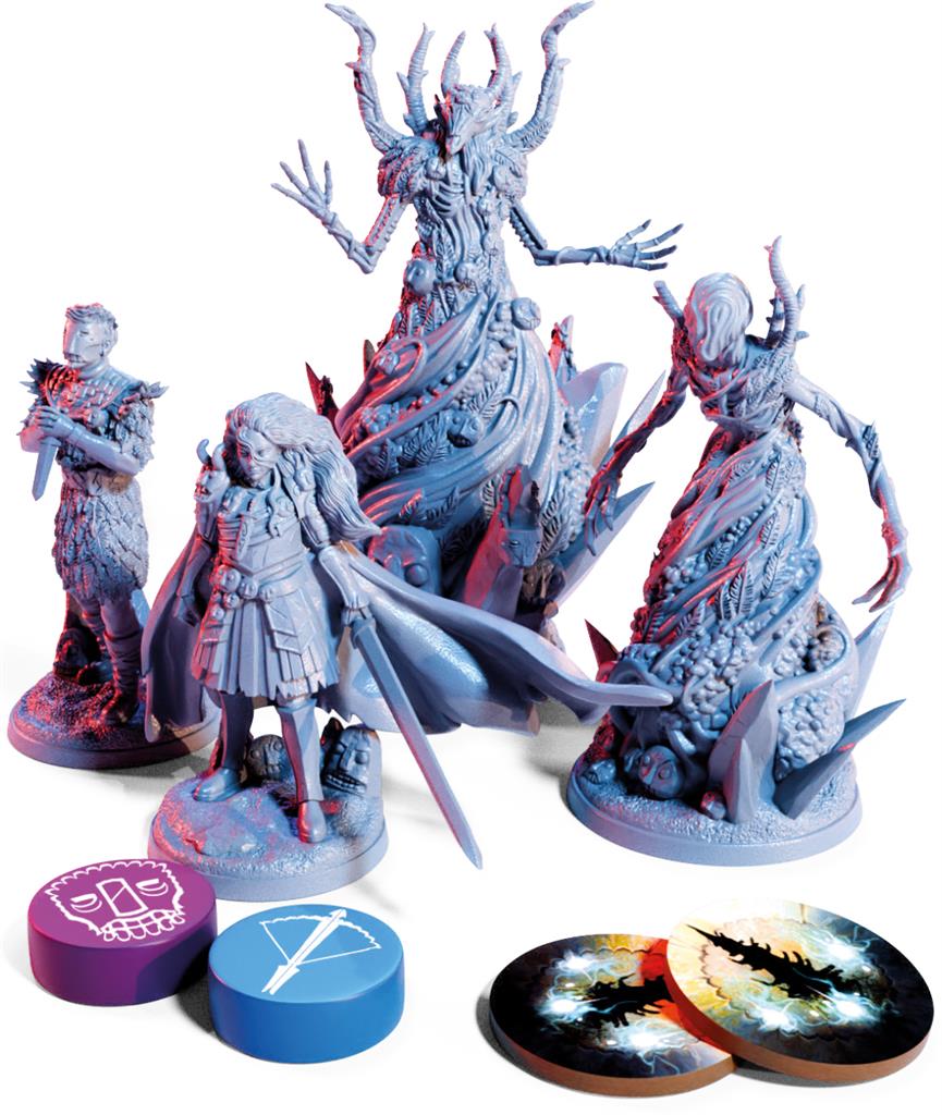 1 livret-jeu narratif (59 pages), 1 plateau de Chasseur, 1 plateau Bête double-face, 30 jetons en bois, 7 cartes Compétence, 6 pions en carton, 6 figurines