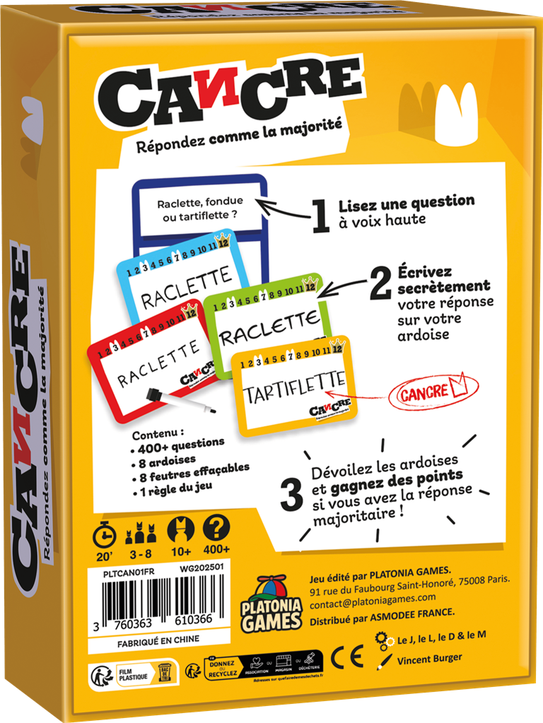 CANCRE est un jeu d’ambiance pour 3 à 8 joueurs autour d'un concept simple : répondre comme la majorité. À chaque tour, un joueur lit une question à voix haute (ex. : « Raclette, fondue ou tartiflette ? »). Les autres écrivent leur réponse secrètement sur leur ardoise. Ensuite, tout le monde révèle sa réponse.