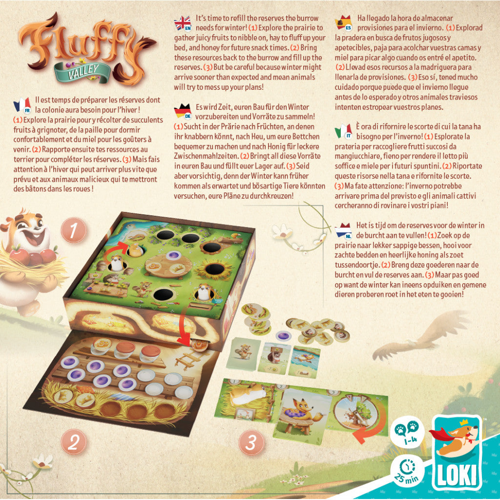 Fluffy Valley est un jeu coopératif. Stockez dans votre Terrier toutes les ressources nécessaires pour passer l’hiver avant la fin de la 9ème manche.