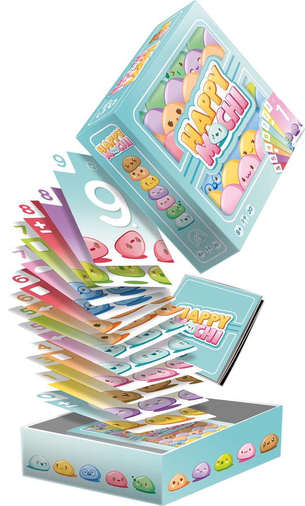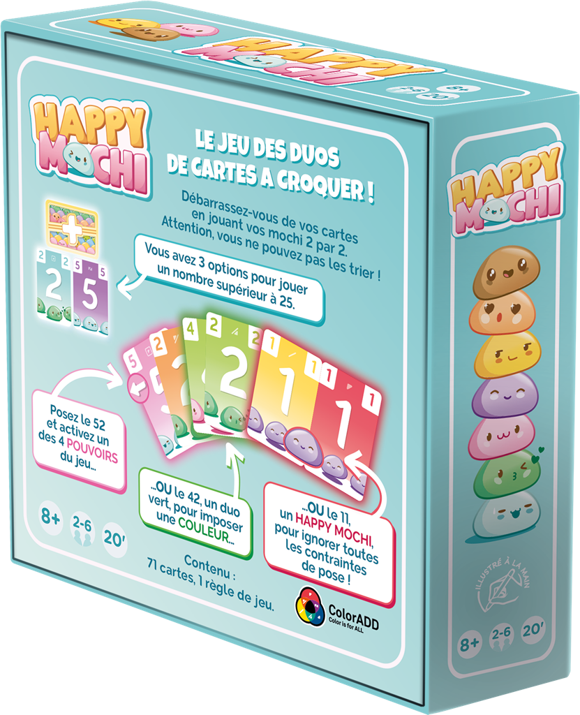 Dans Happy Mochi, vous recevez 7 cartes que vous ne pouvez pas classer ! À votre tour, piochez une carte ou jouez un duo. Pour ce faire, prenez deux cartes ADJACENTES dans votre main pour recouvrir le duo central, en respectant les contraintes de valeur (inférieure ou supérieure) et de couleur. Si vous jouez deux cartes de même valeur, c’est un Happy Mochi, ne tenez pas compte des contraintes ! Une fois un duo joué, appliquez ses effets éventuels : tourner la carte Sens, faire piocher, passer une carte à son voisin, ou mettre une carte en réserve.