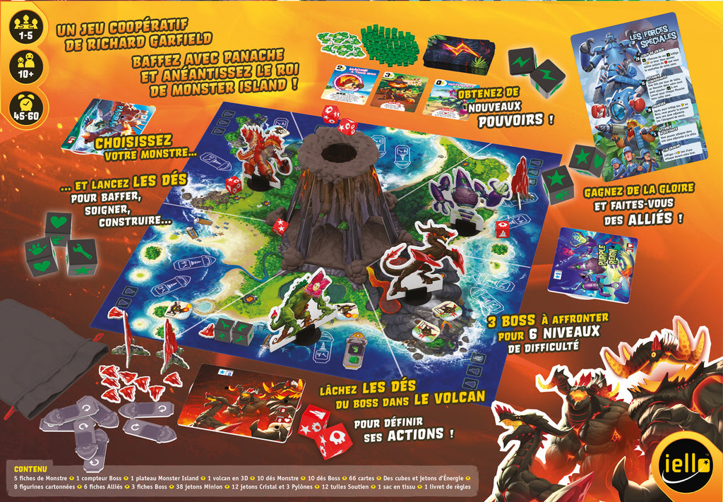 • Contenu : 5 fiches de Monstre, 1 plateau Monster Island, 1 compteur Boss, 1 Volcan en 3D, 10 dés Monstre, 10 dé Boss, 54 cartes Énergie, 12 cartes Évènement, Cubes et Jetons Énergie, 8 figurines cartonnées, 6 fiches Alliés, 3 fiches Boss, 30 jetons Minion, 8 Flammèches, 12 jetons Cristal et 3 Pylônes, 12 tuiles Soutien, 1 Sac en Tissu et 1 livret de règles.