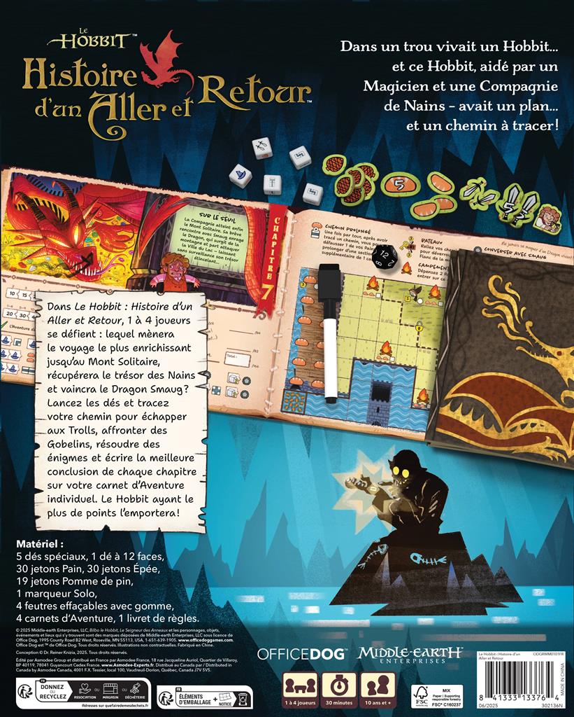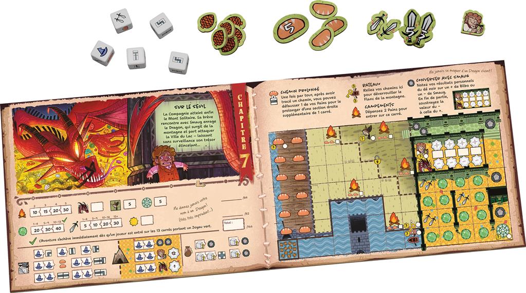 Le Hobbit : Histoire d'un Aller et Retour est un roll&write narratif pour 1 à 4 joueurs. Chacun joue sur son carnet d'aventure individuel, sur lequel il peut tracer son chemin au feutre effaçable. Lancez les dés et choisissez astucieusement ceux qui vous aideront à progresser de façon efficace et récolter les bons bonus.