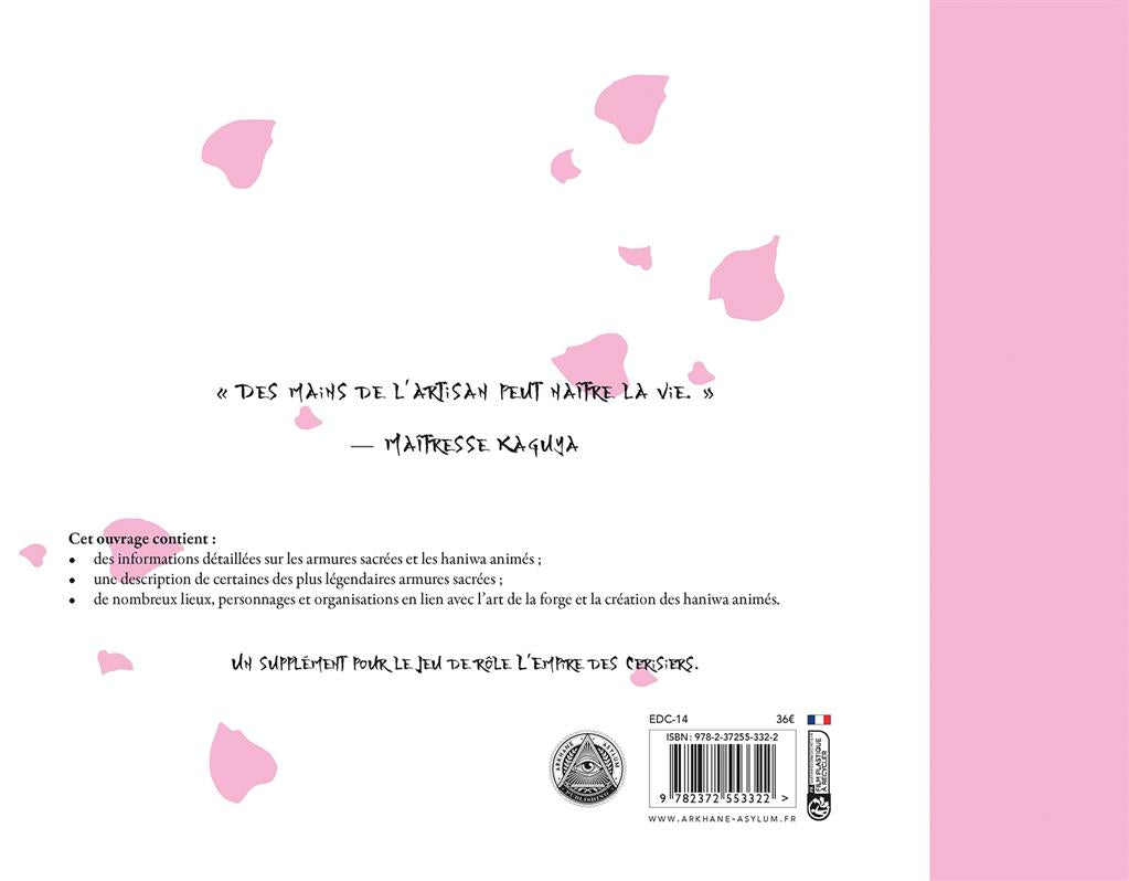 Au sommaire, de nombreuses informations sur la noblesse, l’aristocratie et les seigneurs de guerre de l’Empire des Cerisiers ; une description complète de Chikageshima, la capitale des territoires du clan Taito ; un aperçu des congrégations religieuses de l’Empire, de l’Onmyôdô et un gros plan sur la voie des Huit Roi-Dragons ; une présentation de Kibashijima, la dernière ville d’importance au sud de l’Empire ; des révélations sur Nanda, l’Empereur-Dragon ; etc.
