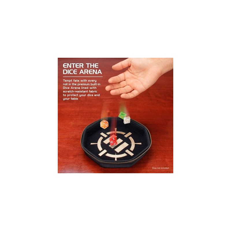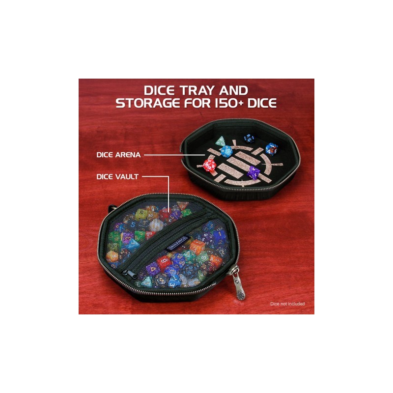 Il s'agit en fait de deux produits en un, une moitié pouvant contenir jusqu'à 150 dés en toute sécurité et l'autre pouvant servir de grand plateau à dés pouvant être déplacé autour de la table de jeu.
