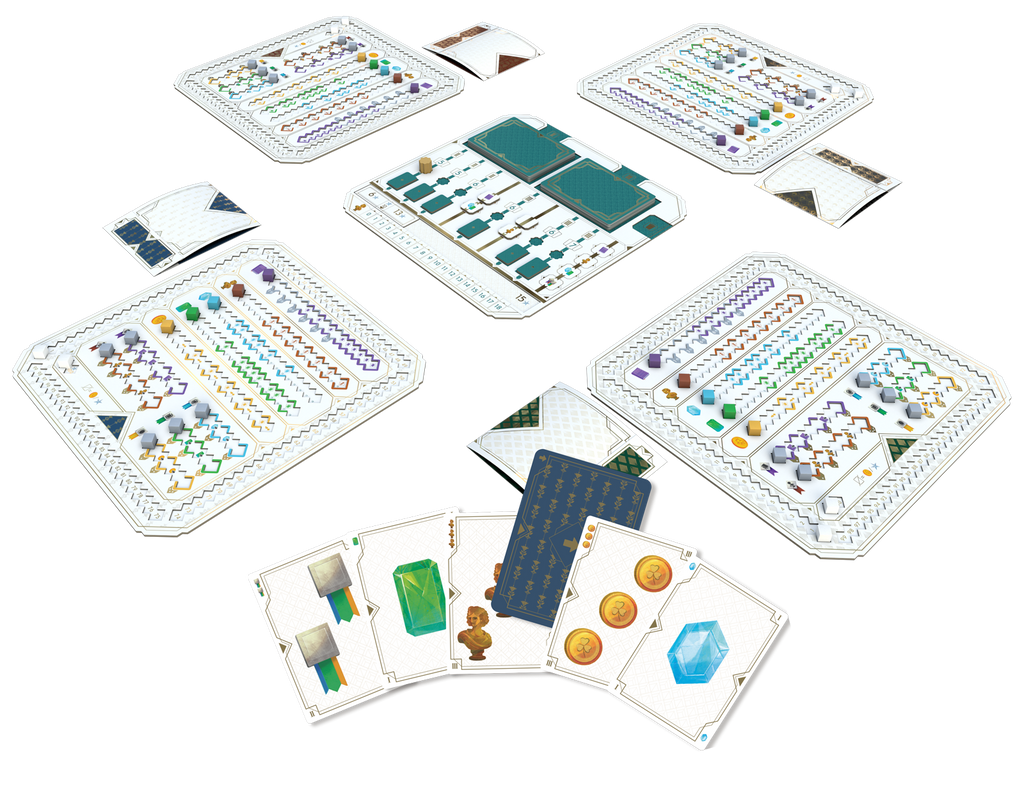 • Contenu : 1 plateau central, 7 plateaux individuels, 7 portefeuilles, 7 cartes séparateurs, 29 cartes Ressource de niveau 1, 21 cartes Ressource de niveau 2, 21 cartes Ressource de niveau 3, 7 tuiles Personnage, 84 cubes Ressource, 1 marqueur Tour, 1 curseur Marché, 4 jetons Décompte, 9 jetons Marché et 1 livret de règles.