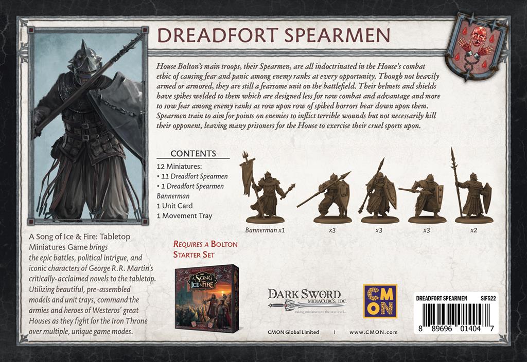 Entraînés à semer la peur et la panique dans les rangs ennemis, les Piquiers de la Maison Bolton sont dénués de tout sens moral. Leurs heaumes et leurs boucliers sont garnis de pointes afin de renforcer leur aspect terrifiant. Ils sont passés maîtres dans l’art d’infliger des blessures douloureuses, mais non fatales, à leurs adversaires, afin qu’une fois la bataille achevée, les nombreux prisonniers puissent permettre aux bourreaux de la Maison Bolton de s’adonner à leurs plaisirs sadiques.