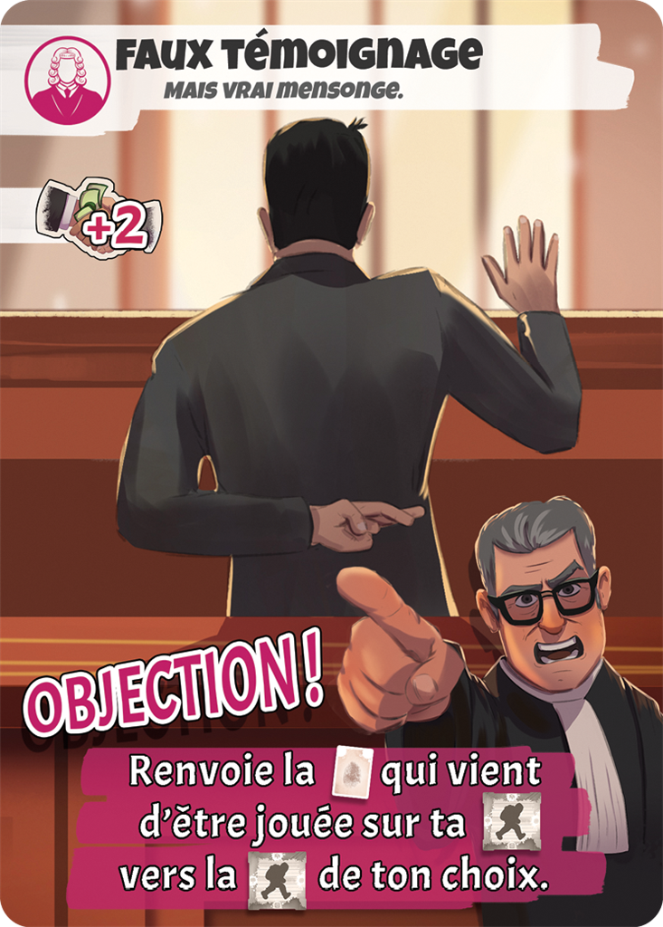 Le jeu mêle bluff, combos de cartes et interactions délicieusement perfides. À chaque tour, vous jouez une carte : preuve pour charger un autre joueur, juré pour alourdir les peines, avocat pour plaider l’innocence… ou objection pour retourner la situation. Les mécaniques permettent des ripostes, des chaînes d’actions et de nombreux retournements de situation.