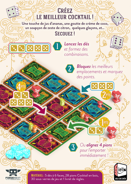 Piña Coladice s'impose en mélangeant habilement stratégie, hasard, et convivialité. Parfait pour animer vos soirées ! Préparez-vous à lancer les dés, à concocter des stratégies gagnantes, et peut-être même à célébrer votre propre Piña Coladice !