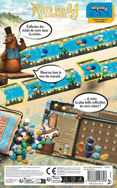 Votre objectif est de remplir votre verrerie en y plaçant au mieux des Éclats de verre collectés dans la rivière. À chaque tour de jeu, placez un des éclats de votre bourse vers une tuile rivière (en respectant les impératifs de forme), puis ramassez les éclats d’une tuile adjacente, ou bien remplissez votre bourse en prenant 4 des 5 éclats présents dans le lac. Prenez garde à ne pas trop en ramasser au risque d’être victime de crue, ce qui vous couterait des points en fin de partie.