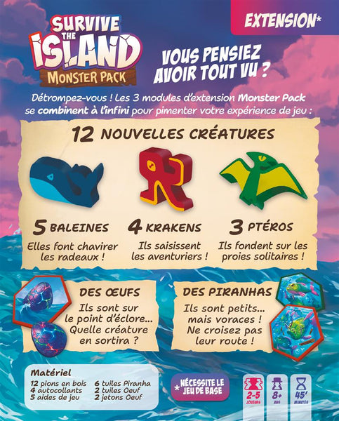 Dans la boîte de base, les joueurs tentaient de s’échapper d’une île en perdition avec le plus de trésors possible… Mais des monstres rôdaient et rendaient la tache difficile. Vous pensiez en être sortis ? C’était sans compter sur l’extension ‘Monster Pack’ ! Désormais des baleines risquent de faire chavirer les radeaux, des krakens saisissent les aventuriers pour les entrainer vers le fond, et des ptérodactyles fondent sur les proies solitaires pour les emporter ! Des œufs sont également disposés dans l’île, quelle créature en sortira ? Quand aux piranhas qui hantent les rivières, autant ne pas croiser leur route.
