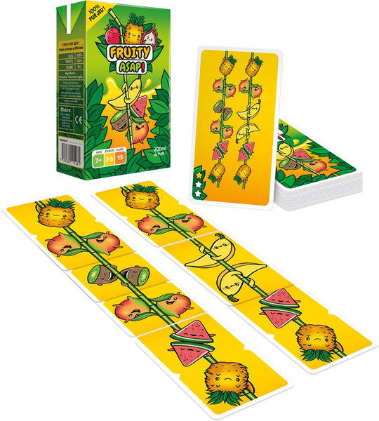 Fruity ASAP est un jeu de rapidité dans lequel les joueurs tentent de reproduire un maximum de Cascades de fruits pour gagner la partie. Reconstituez les cascades de fruits en tournant et en assemblant vos cartes aussi vite que possible ! Le premier qui obtient la configuration demandée remporte la carte.