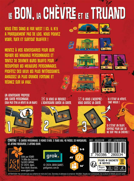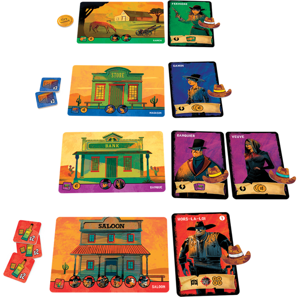 À chaque tour de jeu, un joueur est le Donneur (il change à chaque tour) et a 4 cartes Personnage en main. Sans les montrer aux autres, il en choisir une qu’il pose devant un joueur en lui annonçant ce que c’est… mais il peut mentir ! Le receveur peut choisir de la refuser ou de l’accepter. S’il l’accepte, il la retourne face visible puis la place sur le lieu qui la concerne. S’il la refuse, c’est le Donneur qui la récupère, la révèle et la place. Le Donneur passe ensuite les 3 cartes Personnage restantes au joueur suivant. Ce dernier en pioche une de plus, puis suit le même procédé. Quand tout le monde a reçu un personnage, on refait un tour. Certains personnages ont des pouvoirs qui s’appliquent immédiatement, d’autres qui ne se déclenchent qu’à la phase saloon, en fin de manche. À la fin de la 3ème, le joueur ayant la plus grosse fortune l’emporte. Bluffez pour que votre adversaire refuse la carte que vous voulez récupérer ou pour, au contraire, qu’il l’accepte celle dont vous ne voulez pas.