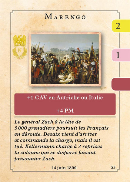Réagissez aux événements historiques des deux périodes 1795-1804 et 1805-1812. Opposé au petit caporal, tissez des alliances avec les autres nations en, guerre (Prusse, Autriche, Russie, Grande-Bretagne), sans perdre de vue votre objectif personnel et secret. Ne laissez pas Napoléon gagner, mais ne permettez pas à vos alliés d’apposer leur empreinte sur l’Europe.