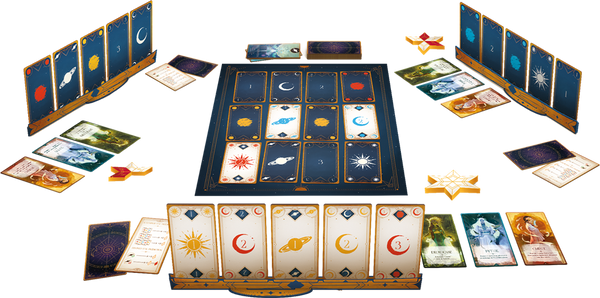 Chaque carte est définie par trois caractéristiques : son astre (Lune, soleil, planète), sa couleur (bleu, rouge, jaune) et sa valeur (1, 2 ou 3), visibles sur le recto de la carte. Mais le verso indique également une de ces informations et est donc visible de vos adversaires.