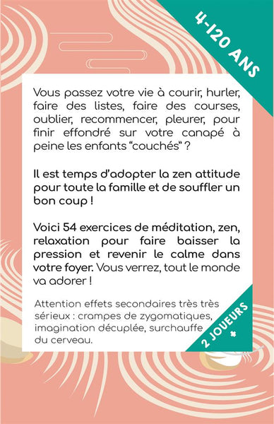 Il est temps d’adopter la zen attitude en famille avec ces 54 exercices de méditation et relaxation pour faire baisser la pression. Le Kit de survie zen est un jeu de 54 cartes pour 2 joueurs au moins, à partir de 4 ans. De quoi se détendre et ramener le calme chez les enfants tout en s’amusant.