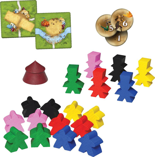 Contenu : 24 tuiles Terrain (symbolisées), 6 Grands Meeple (1 par couleur standard), 8 meeple + 1 abbé roses, 6 tuiles de score 50/100, 1 tuile Rivière avec auberge, Règle du jeu.