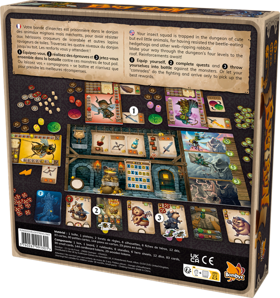 Votre bande d'insectes est prisonnière d'un donjon, enfermée par des animaux habituellement mignons mais ici très méchants : hérissons croqueurs de scarabée et autres lapins ravageurs de toiles. Ensemble, traversez les 4 niveaux du donjon jusqu'au toit. En chemin, achetez de l’équipement, tuez des monstres, réussissez des épreuves. Lancez-vous dans la bataille contre ces monstres de tout poil : affrontez des animaux de plus en plus puissants, en comptant sur vos lancers de dés pour réussir. Vous devrez parfois faire des alliances pour combattre et parfois vous affronter entre joueurs. Vous pouvez aussi laisser vos compagnons combattre les montres et n'arrivez que pour récupérer les meilleur butins. A chacun sa stratégie ! Vous gagnez si vous avez le plus de points de victoire à l'issue de l'évasion finale.