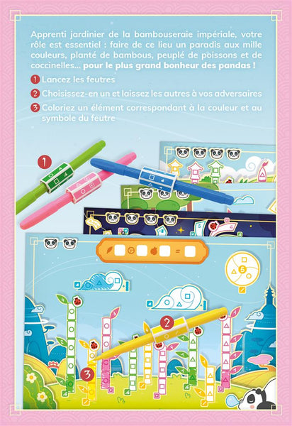 Chacun joue avec le même jardin, choisi parmi les quatre disponibles de niveau facile à difficile. Le premier joueur lance les feutres bagués et en choisit un. Il colorie ensuite sur sa feuille un élément de son jardin correspondant à la couleur du feutre et à l’une des formes obtenues sur la bague. Le joueur suivant choisit l’un des feutres restants, et ainsi de suite. Puis on change de premier joueur et l’on relance les crayons. Quand un joueur termine un bambou, une rivière ou son soleil, il entoure la coccinelle correspondante. Quand toutes les coccinelles d’un jardin ont été entourées, la partie se termine, il est temps de passer au comptage de points. Celui qui en a le plus est nommé meilleur jardinier.