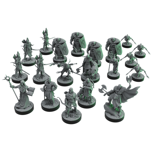 Cinq figurines de héros, prêtes à plonger dans les ténèbres de Davokar.