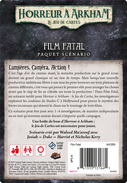 Découvrez cette nouvelle aventure, extension du Jeu de Cartes coopératif Horreur à Arkham. Alors que le cinéma muet est en plein essor, d’étranges événements perturbent les tournages. Les investigateurs sont engagés pour enquêter. Un scénario inédit pour Horreur à Arkham : le jeu de cartes, jouable par 1 à 4 joueurs indépendamment ou inséré dans une campagne. Ce scénario vous propose deux niveaux de difficulté pour s'adapter à votre expérience du jeu.