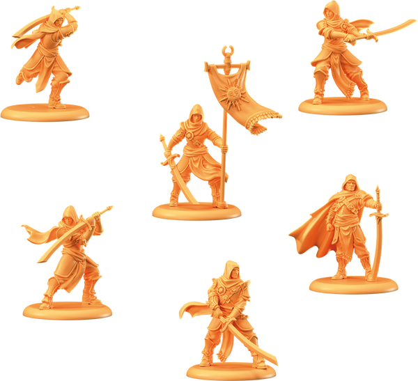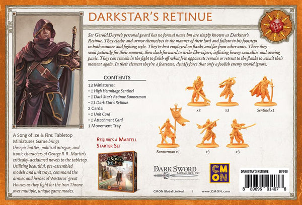 La garde personnelle de Ser Gerold Dayne ne porte aucun nom officiel. Elle est simplement connue sous le nom d’Escorte de Sombre Astre, une appellation bien suffisante pour semer la terreur dans les rangs adverses. En effet, l’Escorte est composée de soldats qui marchent dans les pas de Sombre Astre, tant dans leur comportement que dans leur style de combat. Ils semblent surgir de nulle part, fondant généralement sur un flanc mal protégé, puis disparaissent jusqu’à ce qu’une nouvelle ouverture se présente. Pour autant qu’ils aient laissé des survivants, bien entendu.