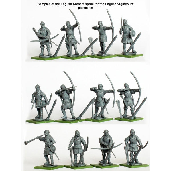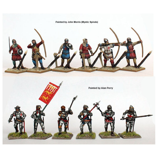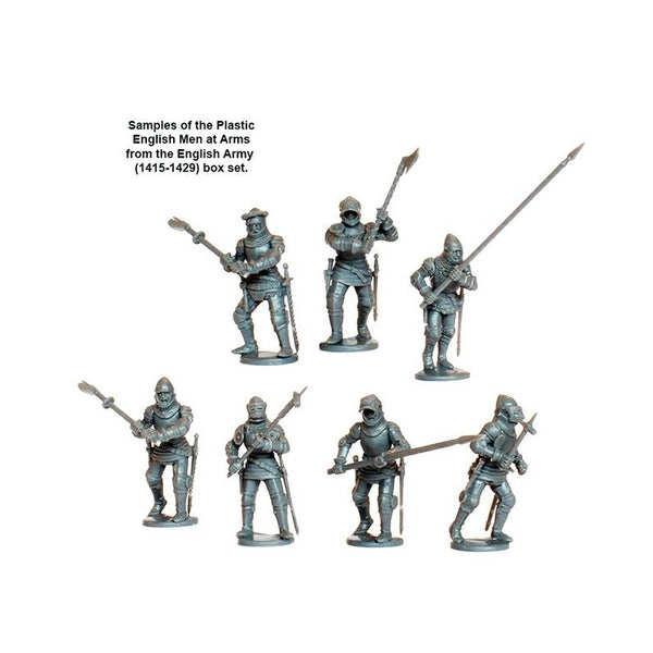 Les figurines de cette boîte représentent l'armée anglaise au plus fort de la guerre de Cent Ans, lorsque les archers anglais dominaient le champ de bataille en France. Plus précisément, les figurines couvrent la période allant de la bataille d'Agincourt (en 1415, lorsque les Anglais étaient menés par Henri V) au siège d'Orléans (1429, lorsque les Français étaient menés par Jeanne d'Arc), qui est devenu le tournant de la guerre. Tous les hommes d'armes sont représentés dans le harnachement complet qui était désormais la norme pour la noblesse. Comme pour la gamme en métal, ils couvrent la première floraison de l'armure complète. Cette armure était principalement arrondie et « globulaire ». Bien qu'elles soient décrites comme étant anglaises, elles pourraient également être utilisées comme françaises. La seule différence réside dans le fait que les Anglais ont tendance à se battre avec des armures non couvertes « blanches » un peu plus que les Français. En ce qui concerne les styles d'armure, la boîte couvre les principaux types utilisés au cours de ces 14 années. À cette époque, les choses ont changé assez rapidement, surtout en ce qui concerne les cuirasses. Des plaques supplémentaires ont été ajoutées au bassinet de base avec queue d'averse, jusqu'à ce que la queue d'averse disparaisse complètement et que l'on obtienne le grand bassinet complet. Les visières en forme de tête de mort sont également devenues globulaires au cours de cette période.