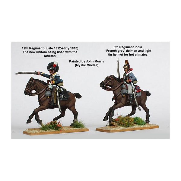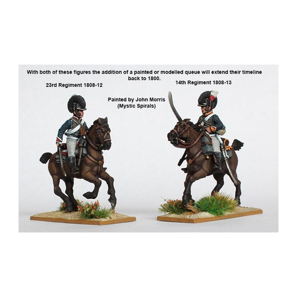 Les figurines de la boîte couvrent tous les régiments des dragons légers britanniques de 1808 à 15. Les uniformes du début de la guerre péninsulaire (comprenant le dolman et le Tarleton classique) ainsi que l'uniforme de la fin de la guerre péninsulaire et de la campagne de Waterloo (comprenant le shako et le manteau « à la française ») sont inclus dans la boîte. Les corps sont fendus au niveau de la taille et les jambes en surplis ainsi que les culottes et les jambes bottées sont fournies pour tous. Les têtes et les casques sont fournis pour les climats tropicaux. Avec l'ajout d'une queue (peinte ou modélisée), les figurines de cette boîte peuvent être utilisées jusqu'en 1800.