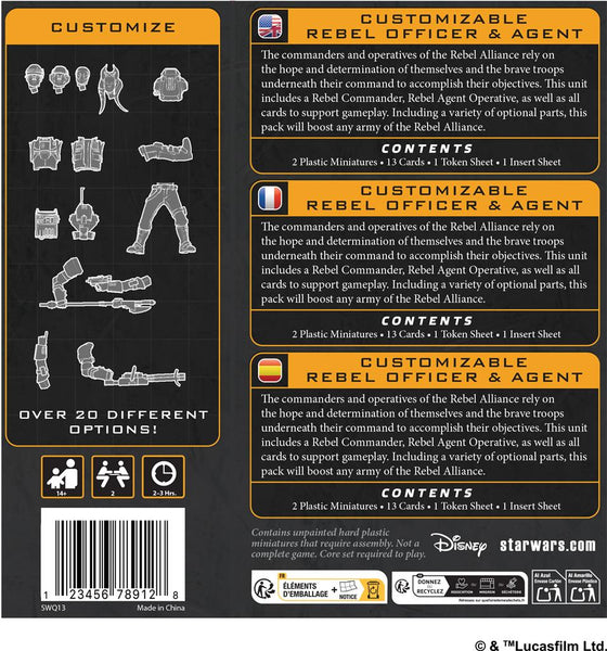 Les commandants et agents de l’Alliance Rebelle s’appuient sur l’espoir et la détermination qu’ils puisent au fond d’eux-mêmes et savent transmettre aux courageux soldats qui combattent à leurs côtés. Cette extension inclut un Commandant Rebelle, un Agent Rebelle. Les nombreuses options de montage proposées (plus de 20) vous permettront de personnaliser vos figurines pour les adapter à votre armée de l’Alliance Rebelle. Vous pourrez également adapter leurs capacités en jeu grâce aux 9 cartes Amélioration incluses, qui vous offrent une grande variété de profils tactiques et de rôles sur le champ de bataille.