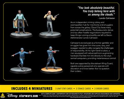 En tant que colonie minière indépendante et plaque tournante cosmopolite pour les marchands et les contrebandiers de toute la galaxie, Cloud City est confrontée à de nombreuses complications potentielles. La danse bureaucratique et les négociations trop souvent hostiles nécessaires au bon fonctionnement des choses sont laissées au baron-administrateur Lando Calrissian. Le passé chargé de Calrissian en tant qu'ancien joueur et contrebandier lui a donné la suavité, l'intelligence et l'assurance nécessaires pour relever avec brio les défis de la responsabilité. À sa droite se trouve Lobot, un homme équipé d'un matériel avancé d'augmentation cérébrale qui lui permet de se connecter directement aux ordinateurs centraux de la ville, offrant un contrôle instantané. Tous deux sont soutenus par la solide Wing Guard, un personnel de police compétent qui opère avec discrétion et sait mieux que quiconque ne pas remettre en question les ordres...