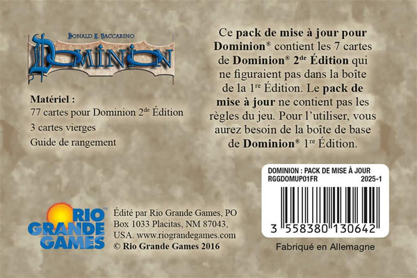 La seconde édition de Dominion® contient des cartes qui ne figuraient pas dans la 1ère. Ce pack a été conçu pour ceux qui veulent mettre à jour leur boîte, sans avoir à acquérir l’intégralité de la nouvelle édition. Il propose les 7 cartes inédites : Artisane, Brigand, Messagère, Marchande, Braconnière, Garde, et Vassal. Chacune d’elles est en plusieurs exemplaires, prêts à être intégrés à votre première édition.