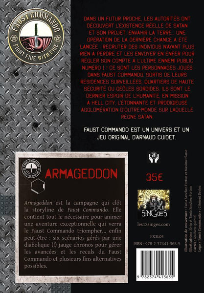 Armageddon contient tout le nécessaire pour animer une aventure exceptionnelle qui verra le Faust Commando triompher... enfin peut-être : six scénarios sous forme d’une trame principale en trois actes qui donneront du fil à retordre aux personnages ainsi que trois grosses missions à déclencher à votre guise pour une expérience unique, une diabolique (!) jauge chronos pour gérer les avancées et les reculs du Faust Commando, plusieurs fins alternatives. Et pour les plus fans, la possibilité de poursuivre le jeu au-delà.