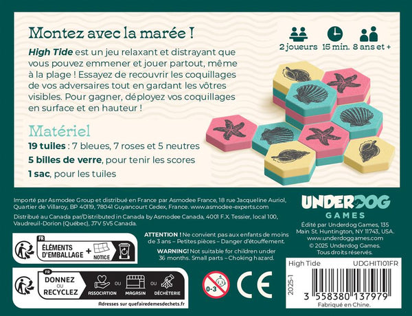 Au gré des marées, les coquillages et crustacés s'amoncellent sur la plage. Dans ce jeu de stratégie abstrait pour 2 joueurs inspiré par le bord de mer (High Tide signifie Marée Haute), vous devrez empilez vos tuiles hexagonales sur celles de votre adversaires. Tentez tour après tour de les recouvrir pour maximiser votre visibilité en fin de partie. Cette mécanique accessible dissimule une vraie tension stratégique. La partie s'achève lorsque l'un de vous ne peut plus déplacer de tuiles lors de son tour. En cas d'égalité, c'est la hauteur de vos piles qui détermine le gagnant de la manche. Le jeu se joue en 3 manches gagnantes.