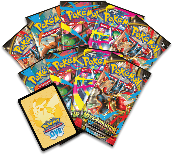9 boosters Méga-Évolution du JCC Pokémon, 1 carte promo brillante entièrement illustrée, 65 protège-cartes, 40 cartes Énergie du JCC Pokémon, 1 guide de jeu de l'extension Méga-Évolution, 6 dés marqueurs de dégâts, 1 dé lancer de pièce autorisé en compétition, 1 pièce en plastique, 1 coffret de collection avec 6 séparateurs, 1 carte à code pour le Jeu de Cartes à Collectionner Pokémon Live