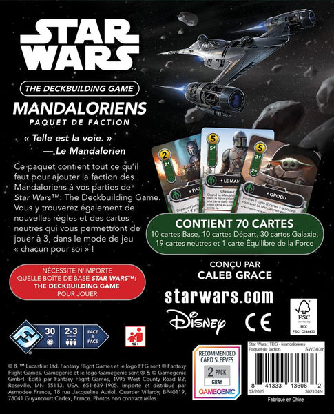 Star Wars™ : The Deckbuilding Game est un jeu compétitif pour deux joueurs vous plongeant dans la guerre entre la République Galactique et l’Alliance Séparatiste, ou l’Empire contre l’Alliance Rebelle. Le paquet de faction des Mandaloriens contient tout ce qu’il faut pour ajouter cette nouvelle faction à vos parties : 10 cartes Base, 10 cartes Départ, 30 cartes Galaxie et 1 carte Équilibre de la Force. Le style de jeu des Mandaloriens se concentre sur l’attaque rapide et le contrôle de la ligne galactique, avec des effets puissants lorsque la Force est équilibrée.