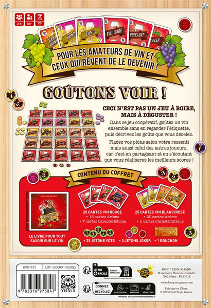 Le jeu propose un contenu riche : cartes vin rouge et vin blanc/rosé, jetons, bouchon, mais aussi un livre complet (84 pages) sur le vin : cépages, arômes, labels, élevage, lexique… Une véritable initiation ludique et immersive. Goûtons Voir ! est un jeu convivial pour les amateurs de vin, qu'ils soient néophytes ou experts. Le vin n'est pas fourni avec le jeu et doit être consommé avec modération.