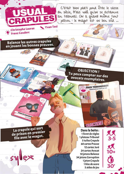Usual Crapules vous embarque dans une ambiance de procès survolté entre anciens braqueurs. Après un casse raté, les joueurs se retrouvent devant le juge : celui qui écopera de la peine la plus courte pourra aller déterrer le magot avant les autres.